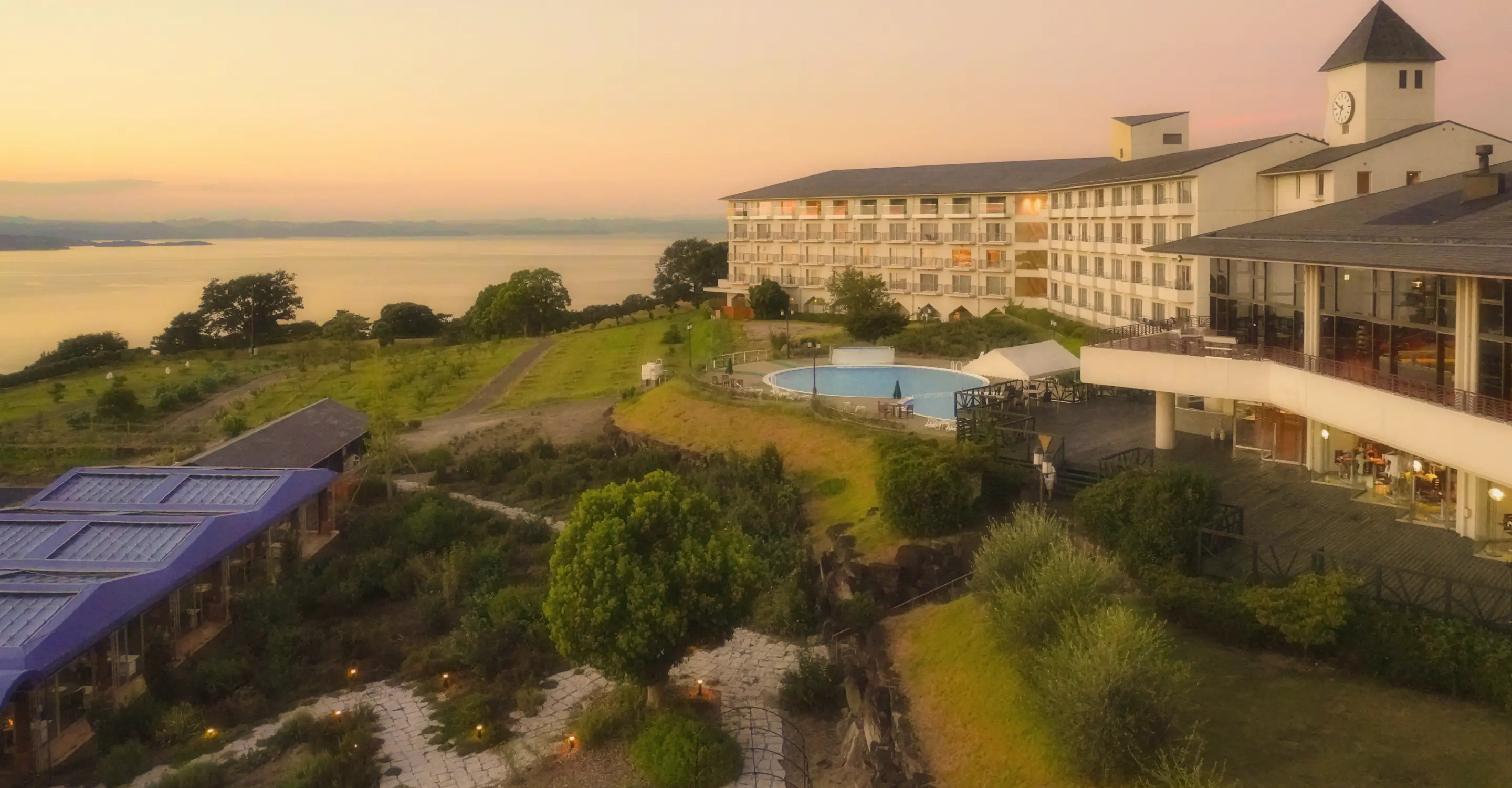 ロビーにて、スパークリングワインやジュースを毎日ご用意しております。晴れた日には、海に沈む夕景を。雨や曇りの日には、暖炉のある落ち着いた空間で、ゆったりとお過ごしいただけます。